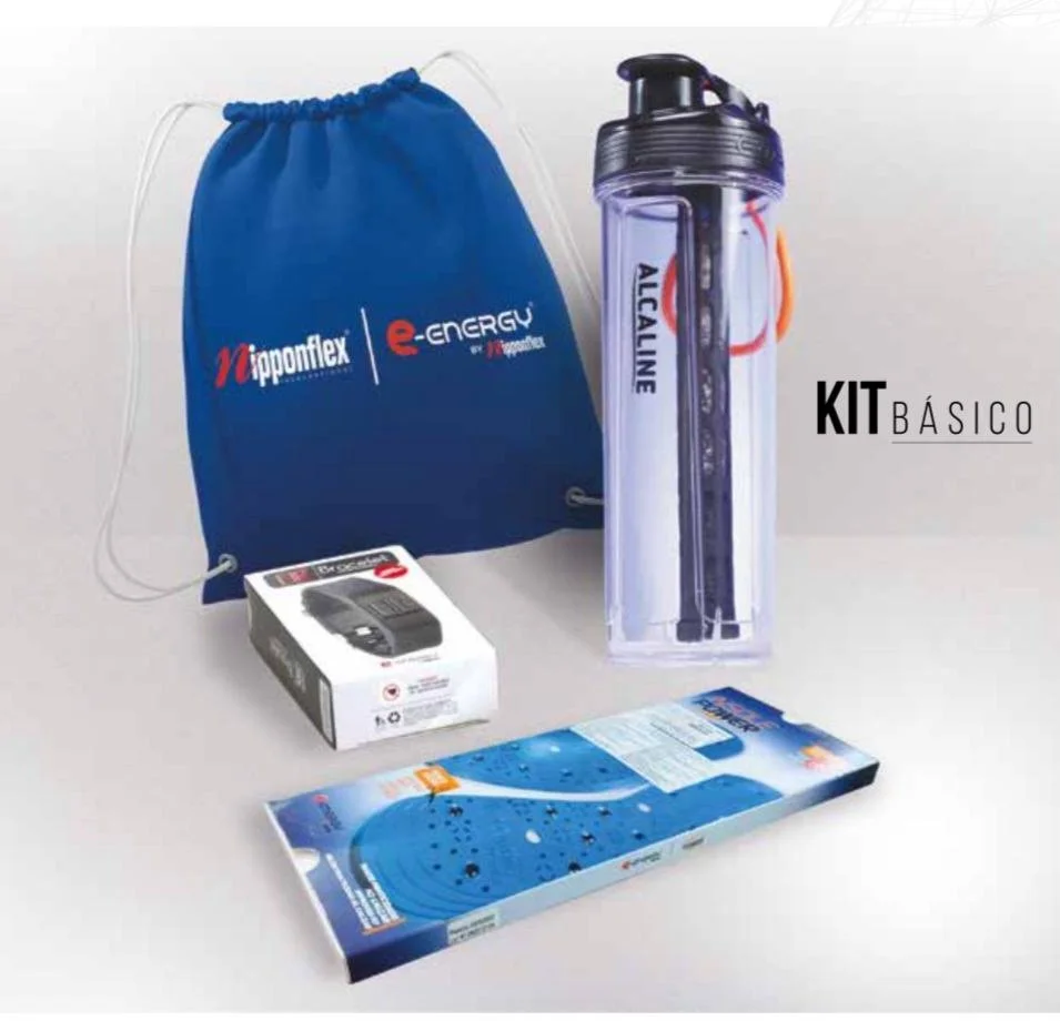 El Kit Básico de Nipponflex incluye tres productos diseñados para promover el bienestar integral: el Brazalete Triple Energy, IONBALLS y las Plantillas FIR GEL.